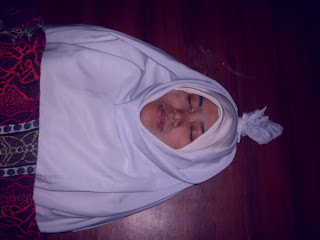 Akhirnya siap. Tugas seterusnya Badrul dan K. Iffah diletakkan ditengah² ruang, lampu dipadamkan dan digantikan dengan nyalaan lilin, kapur barus dibakar untuk mengeluarkan bau seakan² ada orang yang sedang meninggal dunia. Ok dah siap semua, kami (ana dan K Nisa) nak kejutkan mereka nie. Siap!!! Mereka yang lain ambil posisi masing² dihadapan jenazah sambil membaca Yasin.